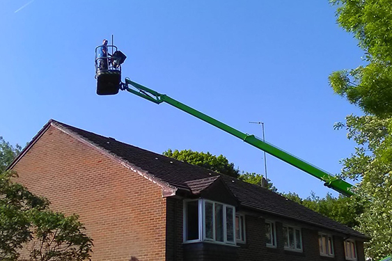We used two specialist spider lift MEWPs to reach all areas safely. Moss was removed, gutters cleared and biocide applied to protect the roof surface.